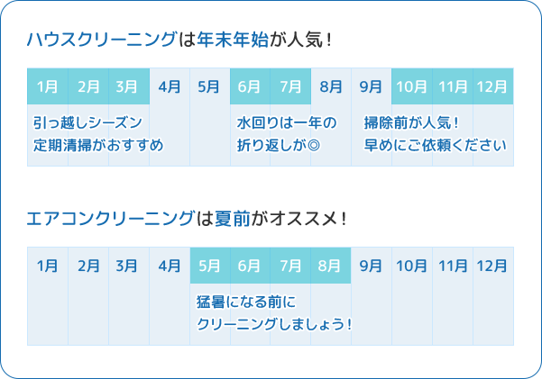 ハウスクリーニング・エアコンクリーニングは困ったときにいつでも頼んで大丈夫です。ただ、1~3月・10~12月は、引っ越し・大掃除で依頼されるお客様が増える時期のため、お早めのご予約をオススメします。エアコンクリーニングは、エアコンを使い始める初夏から夏にかけてが繁忙期にあたります。